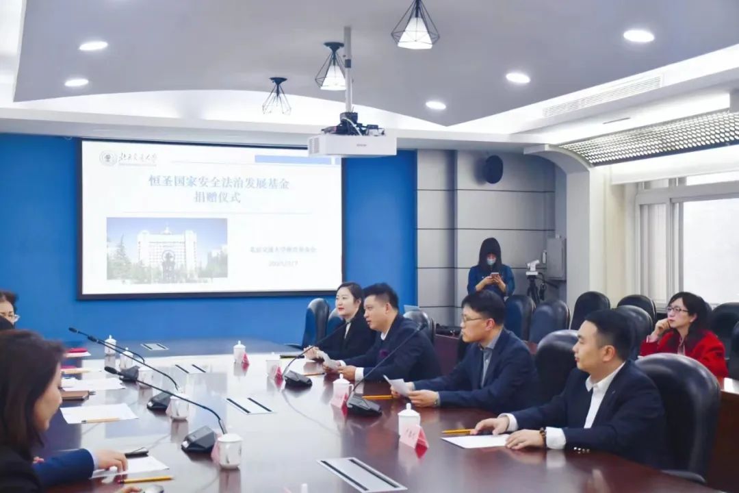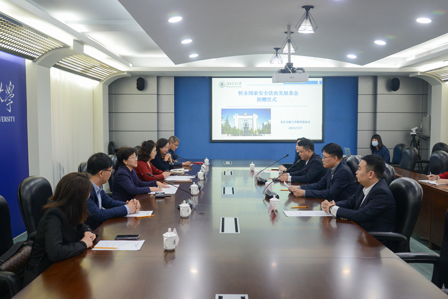 2023年3月7日,“恒圣國家安全法治發(fā)展基金”捐贈儀式在北京交通大學(xué)思源樓舉行。北京交通大學(xué)副校長、教育基金會理事長高艷,北京市恒圣律師事務(wù)所主任馮紅峰、富貓企業(yè)管理集團(tuán)總裁盧泰杉出席儀式。儀式由對外聯(lián)絡(luò)合作處處長、教育基金會秘書長郭雪萌主持。
