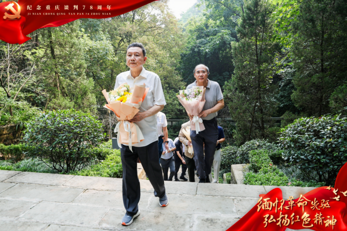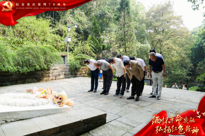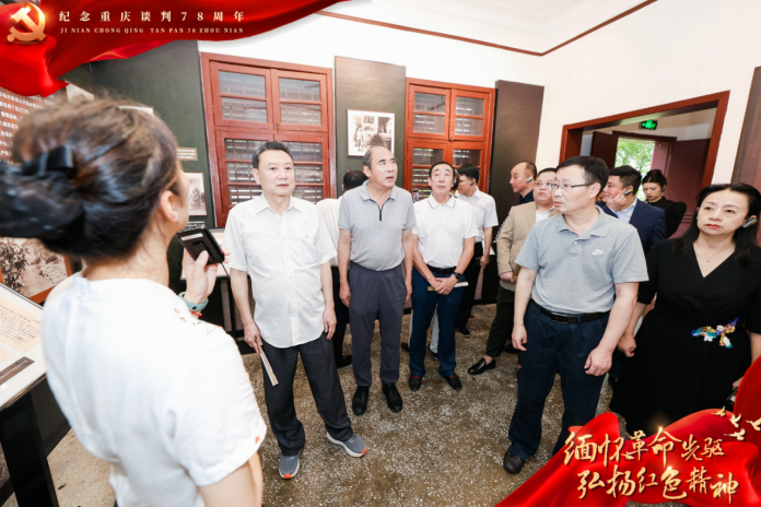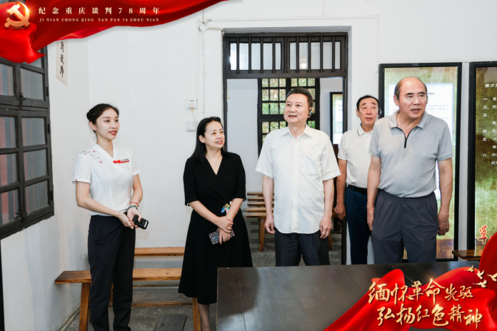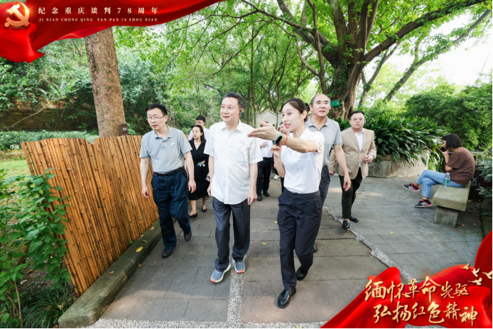 紅巖革命紀念館館長雷瑩(左2)向周秉和先生介紹